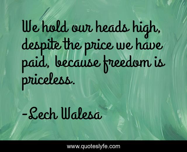 This page presents the quote "We hold our heads high, despite the price we have paid, because freedom is priceless.". Author of this quote is Lech Walesa. This quote is about high, price, hold,.