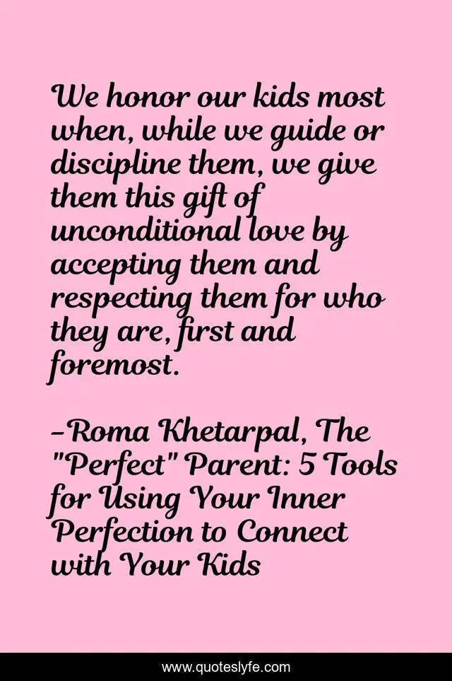 This page presents the quote "We honor our kids most when, while we guide or discipline them, we give them this gift of unconditional love by accepting them and respecting them for who they are, first and foremost.". Author of this quote is Roma Khetarpal, The "Perfect" Parent: 5 Tools for Using Your Inner Perfection to Connect with Your Kids. This quote is about parenting, parenting-children, parenting-advice,.