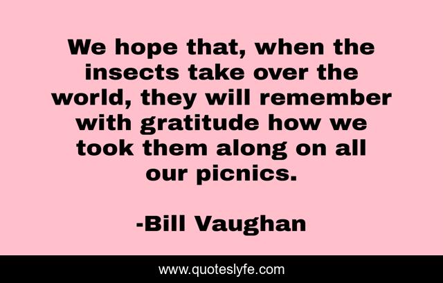 This page presents the quote "We hope that, when the insects take over the world, they will remember with gratitude how we took them along on all our picnics.". Author of this quote is Bill Vaughan. This quote is about gratitude, world, remember,.