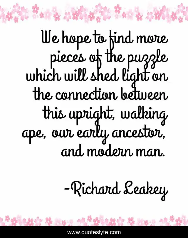 This page presents the quote "We hope to find more pieces of the puzzle which will shed light on the connection between this upright, walking ape, our early ancestor, and modern man.". Author of this quote is Richard Leakey. This quote is about light, walking, man,.