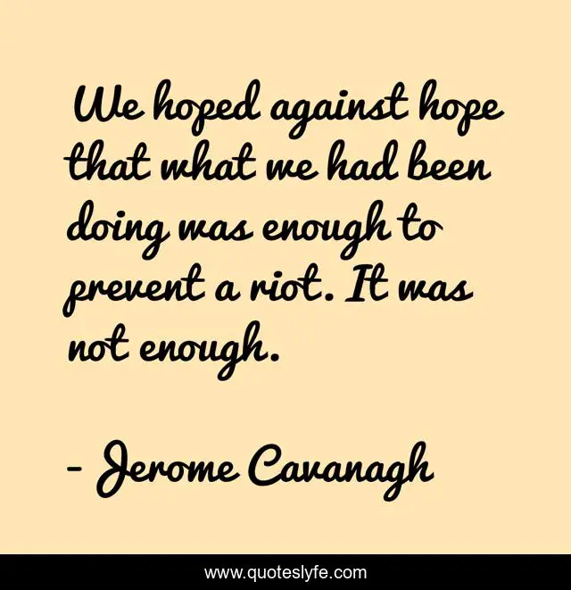 This page presents the quote "We hoped against hope that what we had been doing was enough to prevent a riot. It was not enough.". Author of this quote is Jerome Cavanagh. This quote is about enough, riot,.