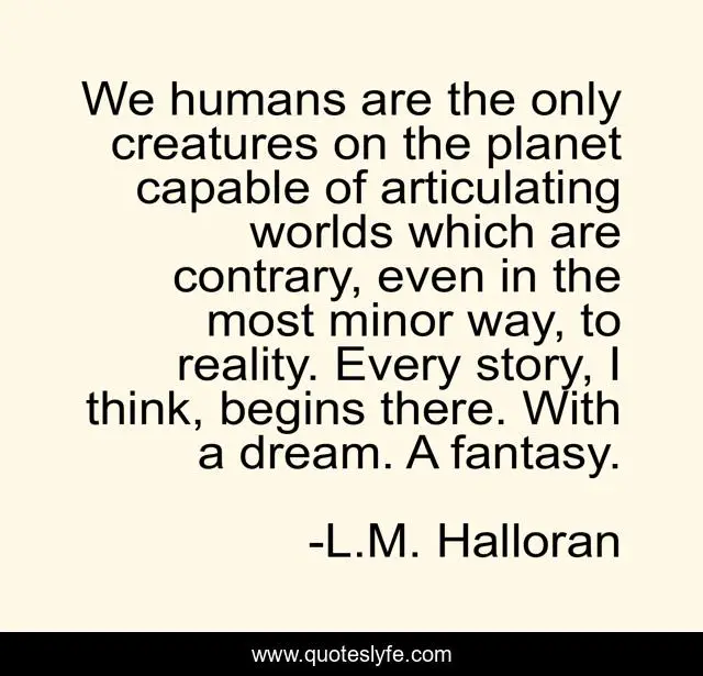 This page presents the quote "We humans are the only creatures on the planet capable of articulating worlds which are contrary, even in the most minor way, to reality. Every story, I think, begins there. With a dream. A fantasy.". Author of this quote is L.M. Halloran. .