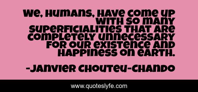 This page presents the quote "We, humans, have come up with so many superficialities that are completely unnecessary for our existence and happiness on earth.". Author of this quote is Janvier Chouteu-Chando. This quote is about love, family, optimistic, confidence, humor, positive, romance, spirituality, enthusiasm,.