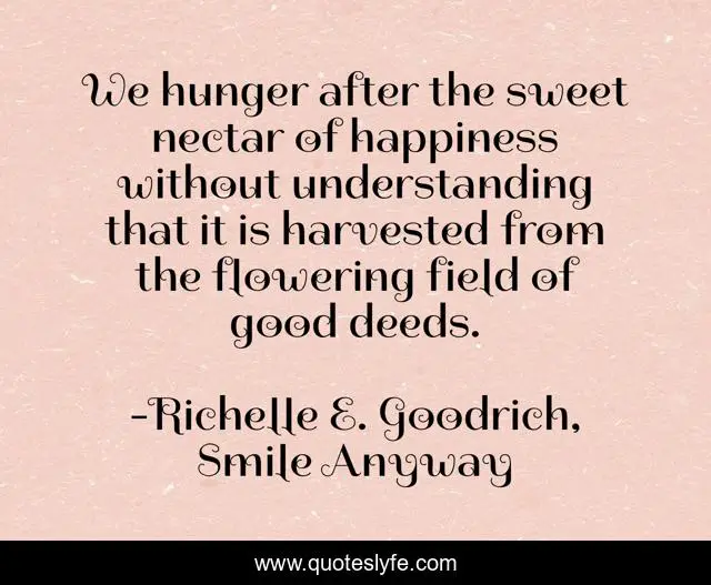 This page presents the quote "We hunger after the sweet nectar of happiness without understanding that it is harvested from the flowering field of good deeds.". Author of this quote is Richelle E. Goodrich, Smile Anyway. This quote is about happy, good-deeds, joy, richelle, richelle-goodrich, kindness, happiness, charity,.