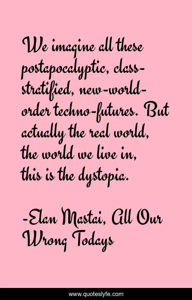 This page presents the quote "We imagine all these postapocalyptic, class-stratified, new-world-order techno-futures. But actually the real world, the world we live in, this is the dystopia.". Author of this quote is Elan Mastai, All Our Wrong Todays. This quote is about dystopia, alternate-reality, reality, time-travel,.