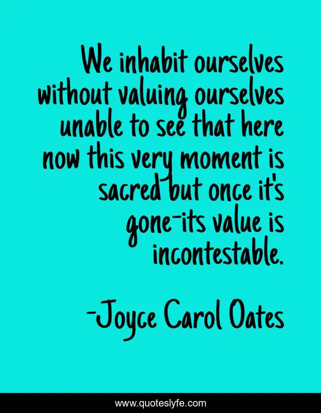 This page presents the quote "We inhabit ourselves without valuing ourselves unable to see that here now this very moment is sacred but once it's gone-its value is incontestable.". Author of this quote is Joyce Carol Oates. .