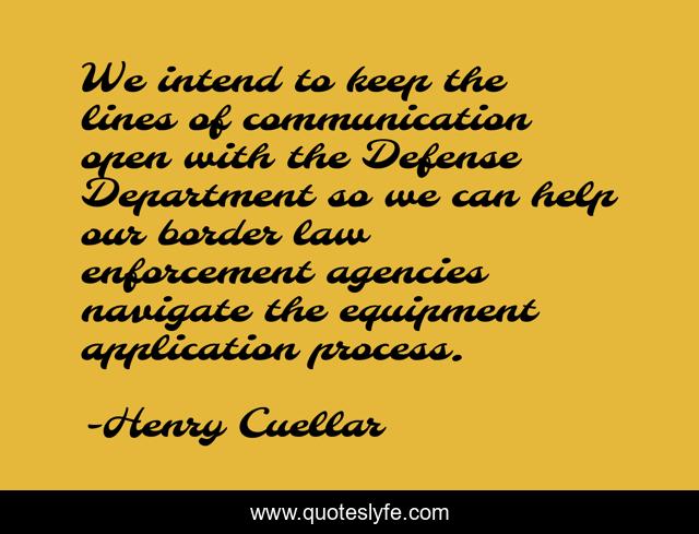 This page presents the quote "We intend to keep the lines of communication open with the Defense Department so we can help our border law enforcement agencies navigate the equipment application process.". Author of this quote is Henry Cuellar. This quote is about law, help, law enforcement,.
