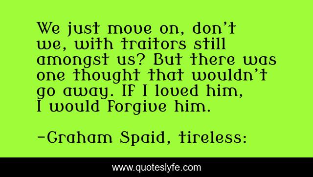This page presents the quote "We just move on, don’t we, with traitors still amongst us? But there was one thought that wouldn’t go away. If I loved him, I would forgive him.". Author of this quote is Graham Spaid, tireless:. This quote is about humor, humorous-fiction, satire, literary-fiction,.