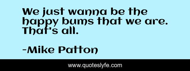 This page presents the quote "We just wanna be the happy bums that we are. That's all.". Author of this quote is Mike Patton. This quote is about complacency, behaviour, attitude, contentment, disposition, happiness,.