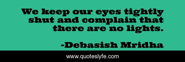 This page presents the quote "We keep our eyes tightly shut and complain that there are no lights.". Author of this quote is Debasish Mridha. This quote is about philosophy, mridha, debasish, eyes-tightly-shut, lights, inspirational, enthusiasm,.