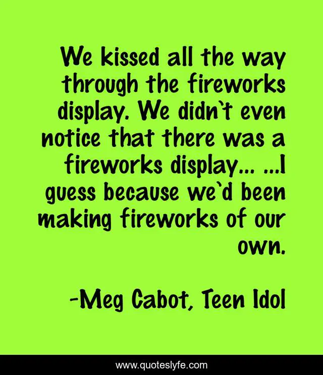 This page presents the quote "We kissed all the way through the fireworks display. We didn’t even notice that there was a fireworks display… …I guess because we’d been making fireworks of our own.". Author of this quote is Meg Cabot, Teen Idol. .