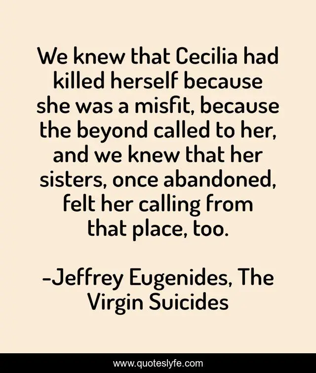 This page presents the quote "We knew that Cecilia had killed herself because she was a misfit, because the beyond called to her, and we knew that her sisters, once abandoned, felt her calling from that place, too.". Author of this quote is Jeffrey Eugenides, The Virgin Suicides. .