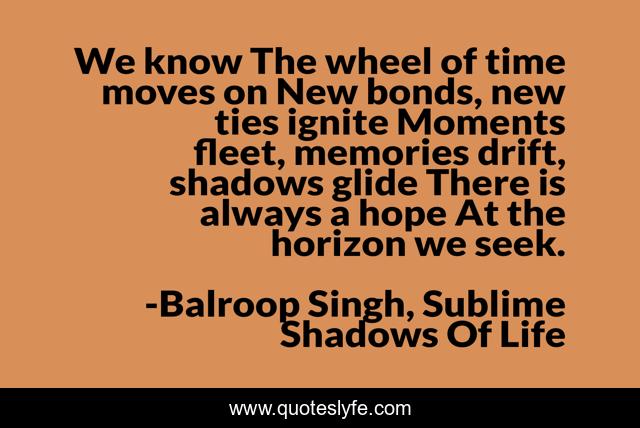 This page presents the quote "We know The wheel of time moves on New bonds, new ties ignite Moments fleet, memories drift, shadows glide There is always a hope At the horizon we seek.". Author of this quote is Balroop Singh, Sublime Shadows Of Life. This quote is about moments, bonding, poetry, hope,.