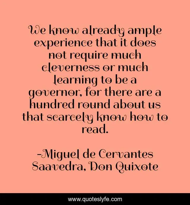 This page presents the quote "We know already ample experience that it does not require much cleverness or much learning to be a governor, for there are a hundred round about us that scarcely know how to read.". Author of this quote is Miguel de Cervantes Saavedra, Don Quixote. .
