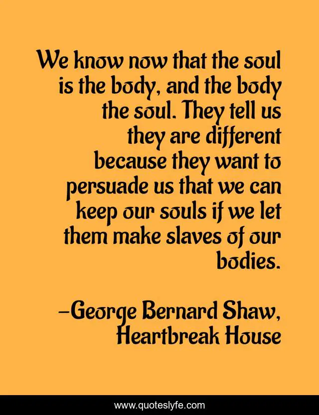 This page presents the quote "We know now that the soul is the body, and the body the soul. They tell us they are different because they want to persuade us that we can keep our souls if we let them make slaves of our bodies.". Author of this quote is George Bernard Shaw, Heartbreak House. This quote is about religion, materialism,.