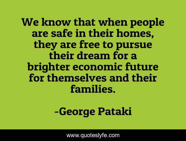This page presents the quote "We know that when people are safe in their homes, they are free to pursue their dream for a brighter economic future for themselves and their families.". Author of this quote is George Pataki. This quote is about future, free, people,.