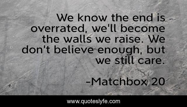 This page presents the quote "We know the end is overrated, we'll become the walls we raise. We don't believe enough, but we still care.". Author of this quote is Matchbox 20. This quote is about ending, loss, strength, belief, inspiration,.