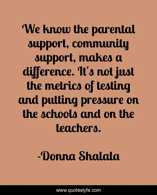 This page presents the quote "We know the parental support, community support, makes a difference. It's not just the metrics of testing and putting pressure on the schools and on the teachers.". Author of this quote is Donna Shalala. This quote is about pressure, support, community,.