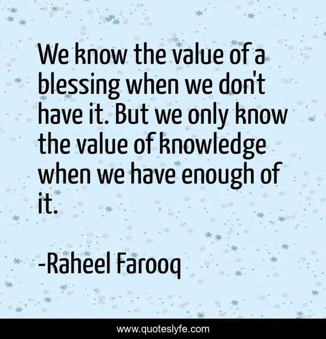 This page presents the quote "We know the value of a blessing when we don't have it. But we only know the value of knowledge when we have enough of it.". Author of this quote is Raheel Farooq. This quote is about wealth, worthiness, blessing, value, wisdom, knowledge,.