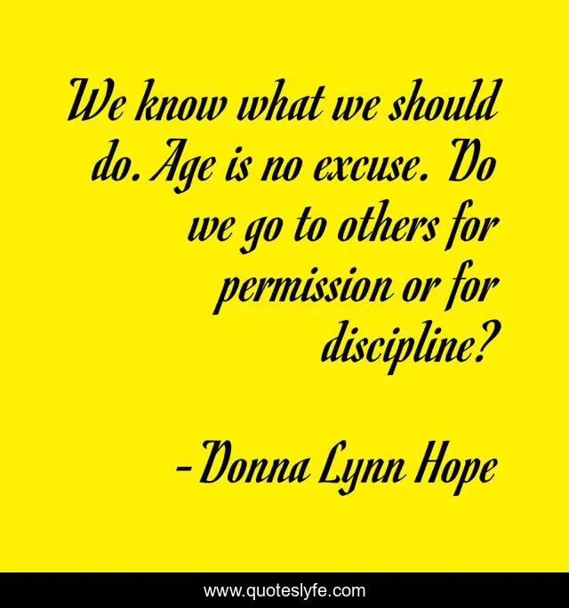 This page presents the quote "We know what we should do. Age is no excuse. Do we go to others for permission or for discipline?". Author of this quote is Donna Lynn Hope. This quote is about discipline, permission, age, accountability, excuses, responsibility,.