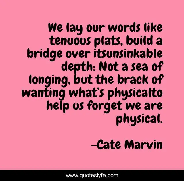 This page presents the quote "We lay our words like tenuous plats, build a bridge over itsunsinkable depth: Not a sea of longing, but the brack of wanting what’s physicalto help us forget we are physical.". Author of this quote is Cate Marvin. This quote is about cate-marvin, poetry,.