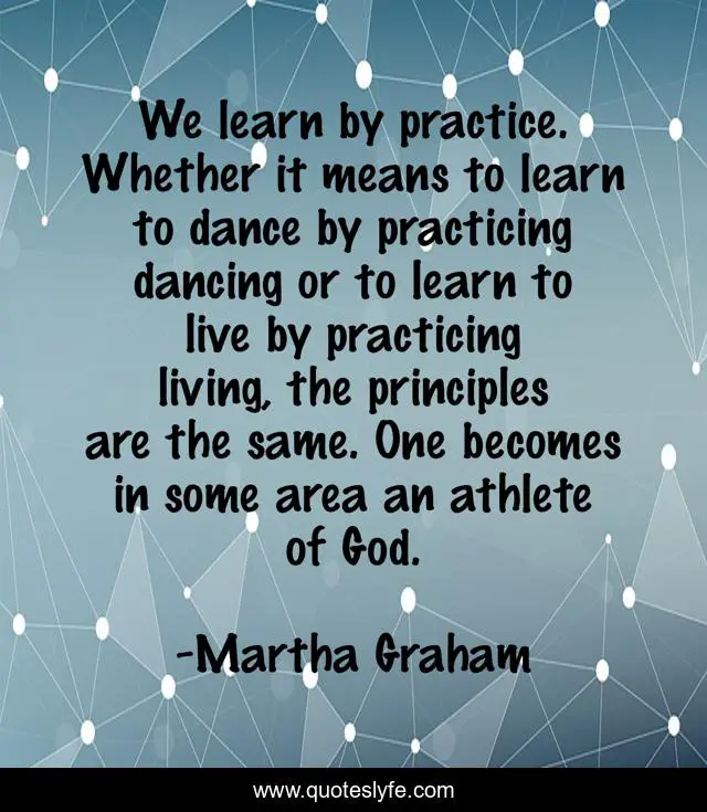 This page presents the quote "We learn by practice. Whether it means to learn to dance by practicing dancing or to learn to live by practicing living, the principles are the same. One becomes in some area an athlete of God.". Author of this quote is Martha Graham. This quote is about dance, god, practice,.