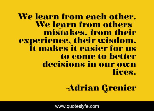 This page presents the quote "We learn from each other. We learn from others' mistakes, from their experience, their wisdom. It makes it easier for us to come to better decisions in our own lives.". Author of this quote is Adrian Grenier. This quote is about mistakes, experience,.
