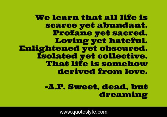 This page presents the quote "We learn that all life is scarce yet abundant. Profane yet sacred. Loving yet hateful. Enlightened yet obscured. Isolated yet collective. That life is somehow derived from love.". Author of this quote is A.P. Sweet, dead, but dreaming. This quote is about life, love, collective, isolated, hateful, life-meaning, enlightened, obscured, affection,.