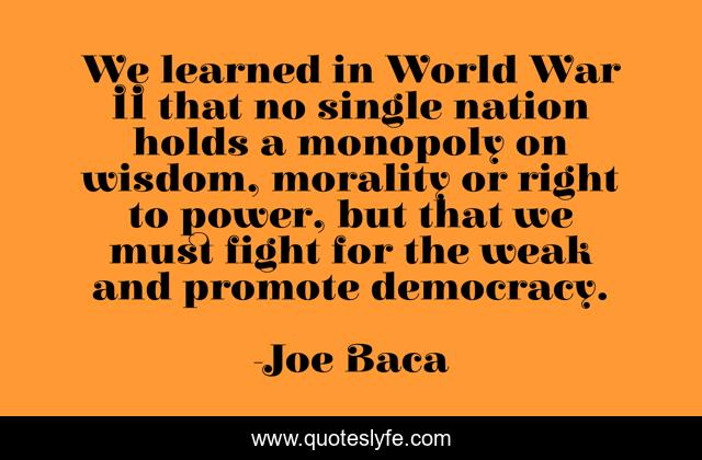 This page presents the quote "We learned in World War II that no single nation holds a monopoly on wisdom, morality or right to power, but that we must fight for the weak and promote democracy.". Author of this quote is Joe Baca. This quote is about world, war, power,.