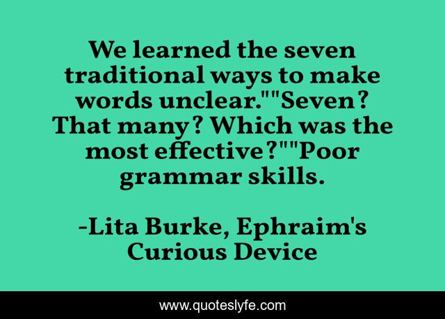 This page presents the quote "We learned the seven traditional ways to make words unclear.""Seven? That many? Which was the most effective?""Poor grammar skills.". Author of this quote is Lita Burke, Ephraim's Curious Device. This quote is about magic, steampunk, wizard, dragon, fantasy, quest, humor,.