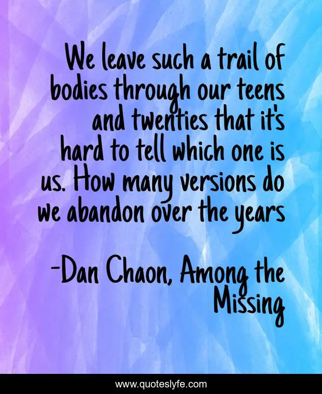 This page presents the quote "We leave such a trail of bodies through our teens and twenties that it's hard to tell which one is us. How many versions do we abandon over the years". Author of this quote is Dan Chaon, Among the Missing. This quote is about big-me, teenagers, short-story,.