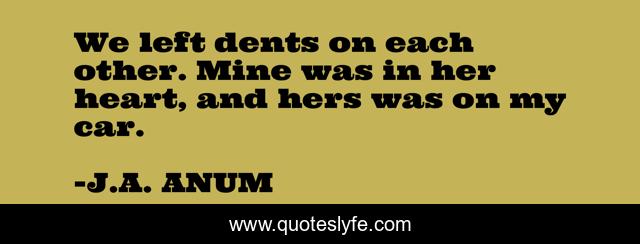 This page presents the quote "We left dents on each other. Mine was in her heart, and hers was on my car.". Author of this quote is J.A. ANUM. This quote is about relationships, love, humour, breakups, poetry, quotes, humor, popular, poems,.