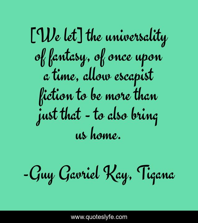 This page presents the quote "[We let] the universality of fantasy, of once upon a time, allow escapist fiction to be more than just that - to also bring us home.". Author of this quote is Guy Gavriel Kay, Tigana. This quote is about fantasy, afterword,.
