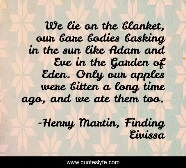 This page presents the quote "We lie on the blanket, our bare bodies basking in the sun like Adam and Eve in the Garden of Eden. Only our apples were bitten a long time ago, and we ate them too.". Author of this quote is Henry Martin, Finding Eivissa. This quote is about literary, romance, great, literary-fiction, romantic,.
