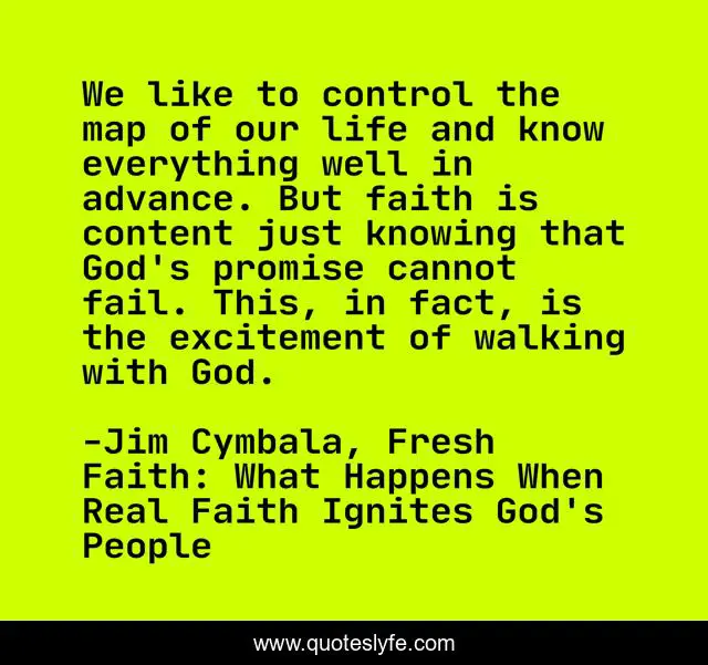 This page presents the quote "We like to control the map of our life and know everything well in advance. But faith is content just knowing that God's promise cannot fail. This, in fact, is the excitement of walking with God.". Author of this quote is Jim Cymbala, Fresh Faith: What Happens When Real Faith Ignites God's People. This quote is about control, faith, promises-of-god, christian-living, god,.