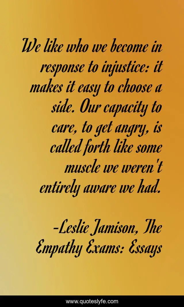 This page presents the quote "We like who we become in response to injustice: it makes it easy to choose a side. Our capacity to care, to get angry, is called forth like some muscle we weren't entirely aware we had.". Author of this quote is Leslie Jamison, The Empathy Exams: Essays. This quote is about empathy, injustice,.