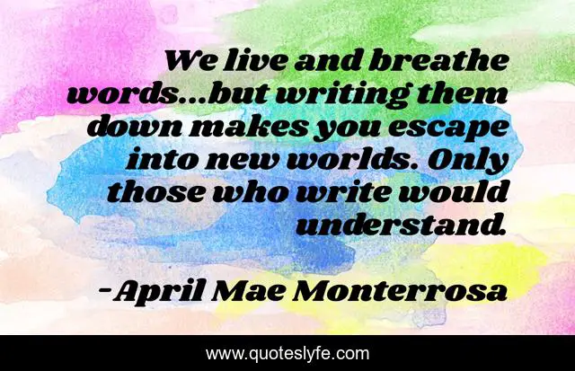 This page presents the quote "We live and breathe words...but writing them down makes you escape into new worlds. Only those who write would understand.". Author of this quote is April Mae Monterrosa. This quote is about author, about-writing, writing, write, escaping-through-writing, escaping-from-reality,.