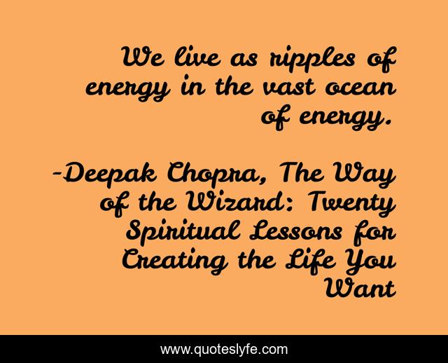 This page presents the quote "We live as ripples of energy in the vast ocean of energy.". Author of this quote is Deepak Chopra, The Way of the Wizard: Twenty Spiritual Lessons for Creating the Life You Want. This quote is about spirituality, energy, life,.