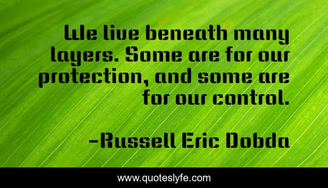 This page presents the quote "We live beneath many layers. Some are for our protection, and some are for our control.". Author of this quote is Russell Eric Dobda. This quote is about control, layers, protection, illusion,.
