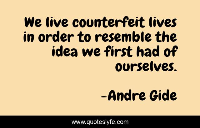 This page presents the quote "We live counterfeit lives in order to resemble the idea we first had of ourselves.". Author of this quote is Andre Gide. .