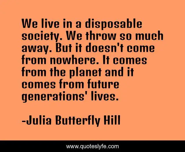 This page presents the quote "We live in a disposable society. We throw so much away. But it doesn't come from nowhere. It comes from the planet and it comes from future generations' lives.". Author of this quote is Julia Butterfly Hill. This quote is about live, future,.
