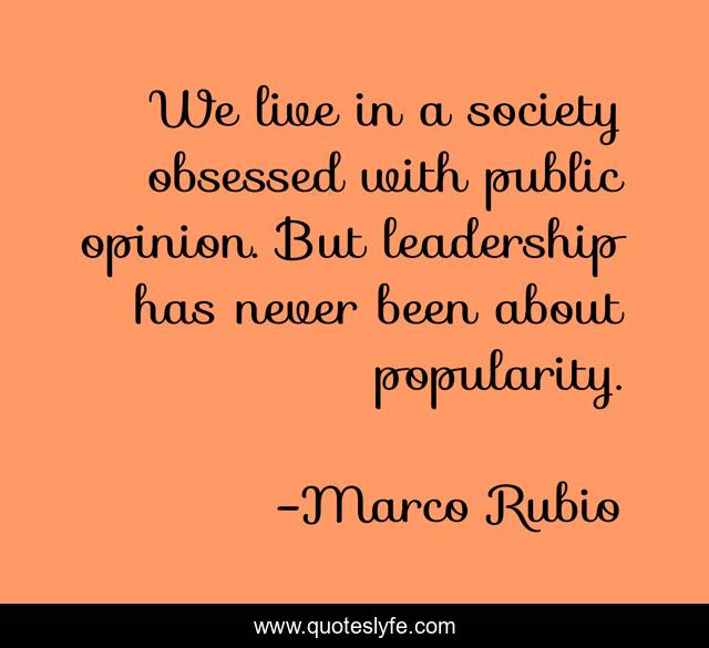 This page presents the quote "We live in a society obsessed with public opinion. But leadership has never been about popularity.". Author of this quote is Marco Rubio. This quote is about society, live, opinion,.
