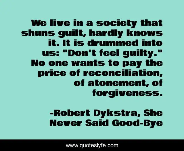 This page presents the quote "We live in a society that shuns guilt, hardly knows it. It is drummed into us: "Don't feel guilty." No one wants to pay the price of reconciliation, of atonement, of forgiveness.". Author of this quote is Robert Dykstra, She Never Said Good-Bye. This quote is about life, psychology,.