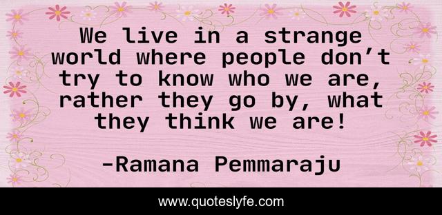 This page presents the quote "We live in a strange world where people don’t try to know who we are, rather they go by, what they think we are!". Author of this quote is Ramana Pemmaraju. This quote is about life, people, thinking, perception-of-others, strange, life-philosophy, misconception, reality,.