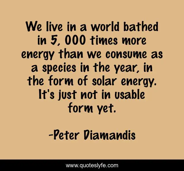 This page presents the quote "We live in a world bathed in 5, 000 times more energy than we consume as a species in the year, in the form of solar energy. It's just not in usable form yet.". Author of this quote is Peter Diamandis. This quote is about world, energy, live,.