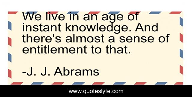 This page presents the quote "We live in an age of instant knowledge. And there's almost a sense of entitlement to that.". Author of this quote is J. J. Abrams. This quote is about age, live, sense,.
