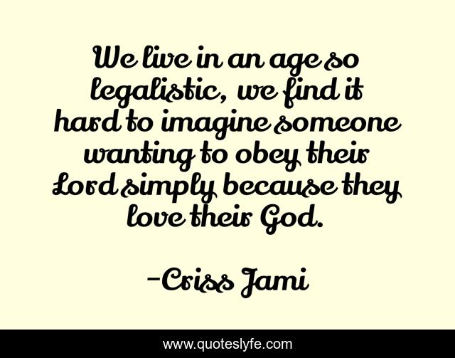 This page presents the quote "We live in an age so legalistic, we find it hard to imagine someone wanting to obey their Lord simply because they love their God.". Author of this quote is Criss Jami. This quote is about legalism, god, obedience, love, grace, affection,.