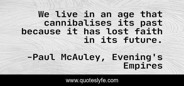 This page presents the quote "We live in an age that cannibalises its past because it has lost faith in its future.". Author of this quote is Paul McAuley, Evening's Empires. .