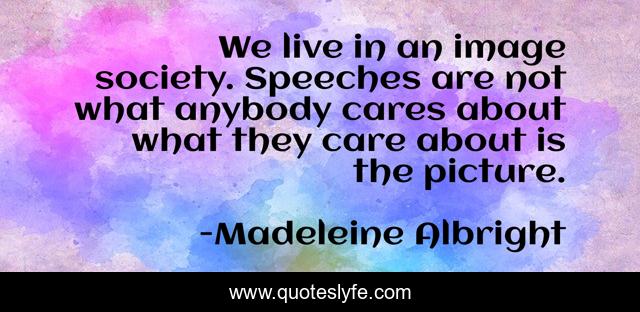 This page presents the quote "We live in an image society. Speeches are not what anybody cares about what they care about is the picture.". Author of this quote is Madeleine Albright. This quote is about picture, live, care,.