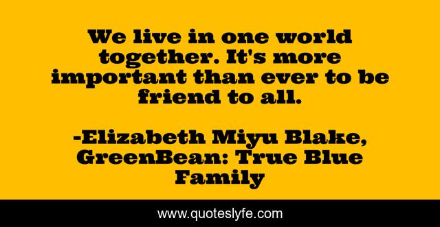 This page presents the quote "We live in one world together. It's more important than ever to be friend to all.". Author of this quote is Elizabeth Miyu Blake, GreenBean: True Blue Family. This quote is about belonging, differences, adoption, identity,.
